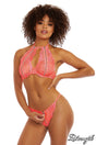 - High halter lace bra with thick underwired cups featuring fully functional zippers on the bust, a tie-neck and a tie-back closure.