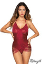 Stretch mesh teddy draped over by a full fringe featuring an halter tie-neck closure, a fully open back featuring 2 elastic straps and a snap crotch closure
