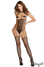 Fishnet teddy bodystocking with a delicate lace pattern along the middle, a halter lace neckline featuring a tie-back closure, an open bust and attached elastic garters linked to the matching thigh high stockings. (Pasties not included)